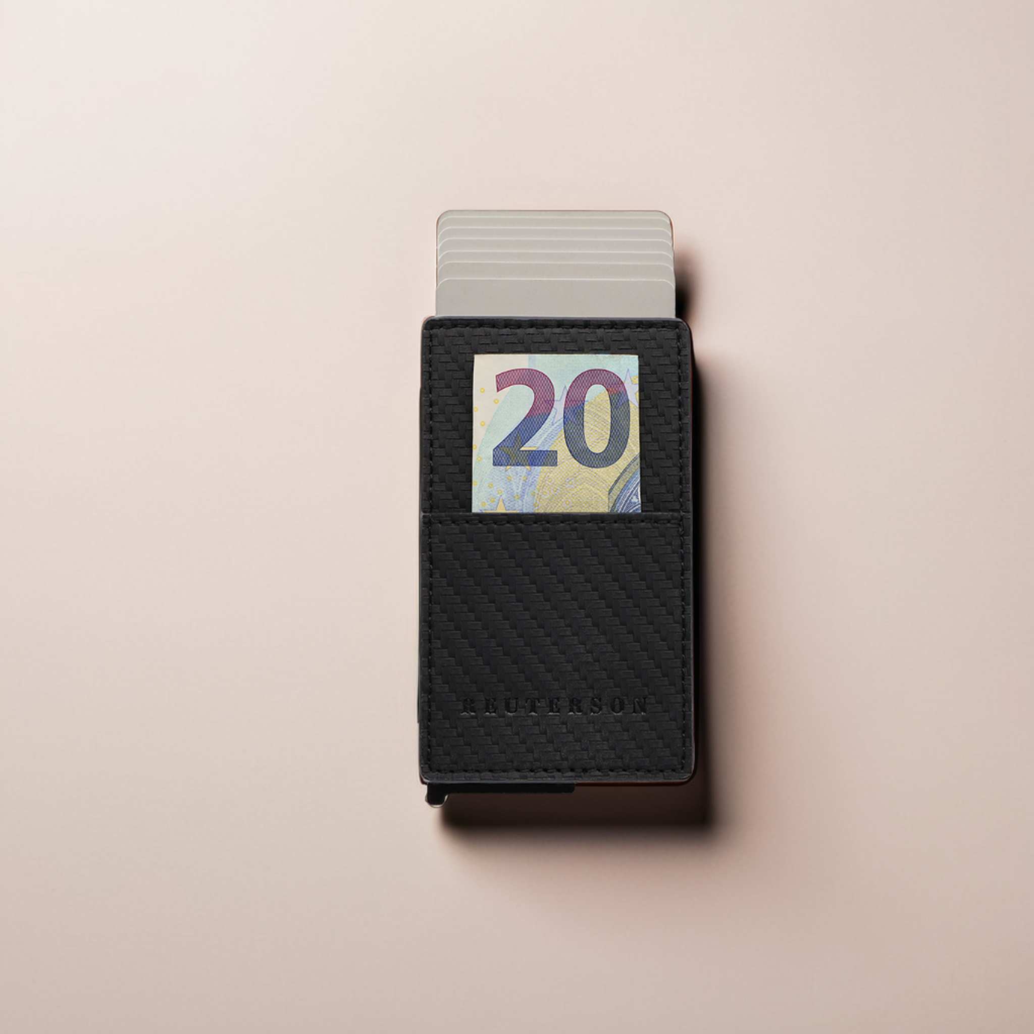 Il portafoglio di alta qualità in carbonio con meccanismo a scorrimento, scomparto per banconote e tasca per monete – per la massima funzionalità in un design elegante.